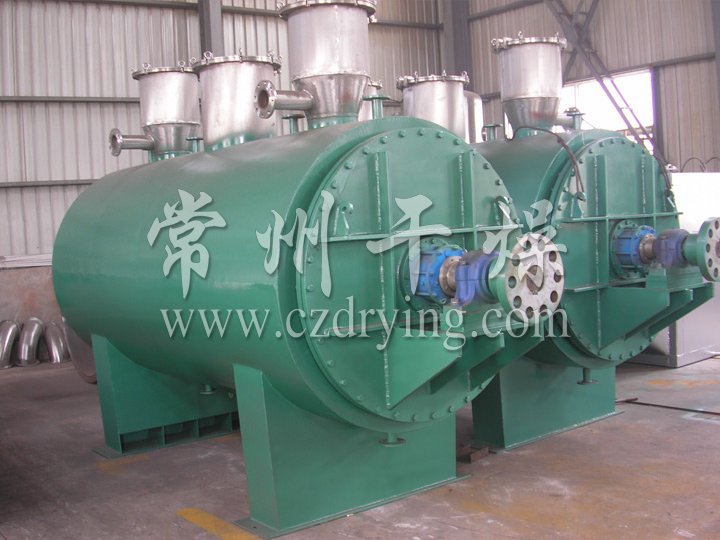 本機是一種新穎臥式間歇式真空干燥設備,濕物料經傳導蒸發,帶有刮板攪拌器不斷清除熱面上的物料,并在容器內推移形成循環流,水份蒸發后由真空泵抽出。